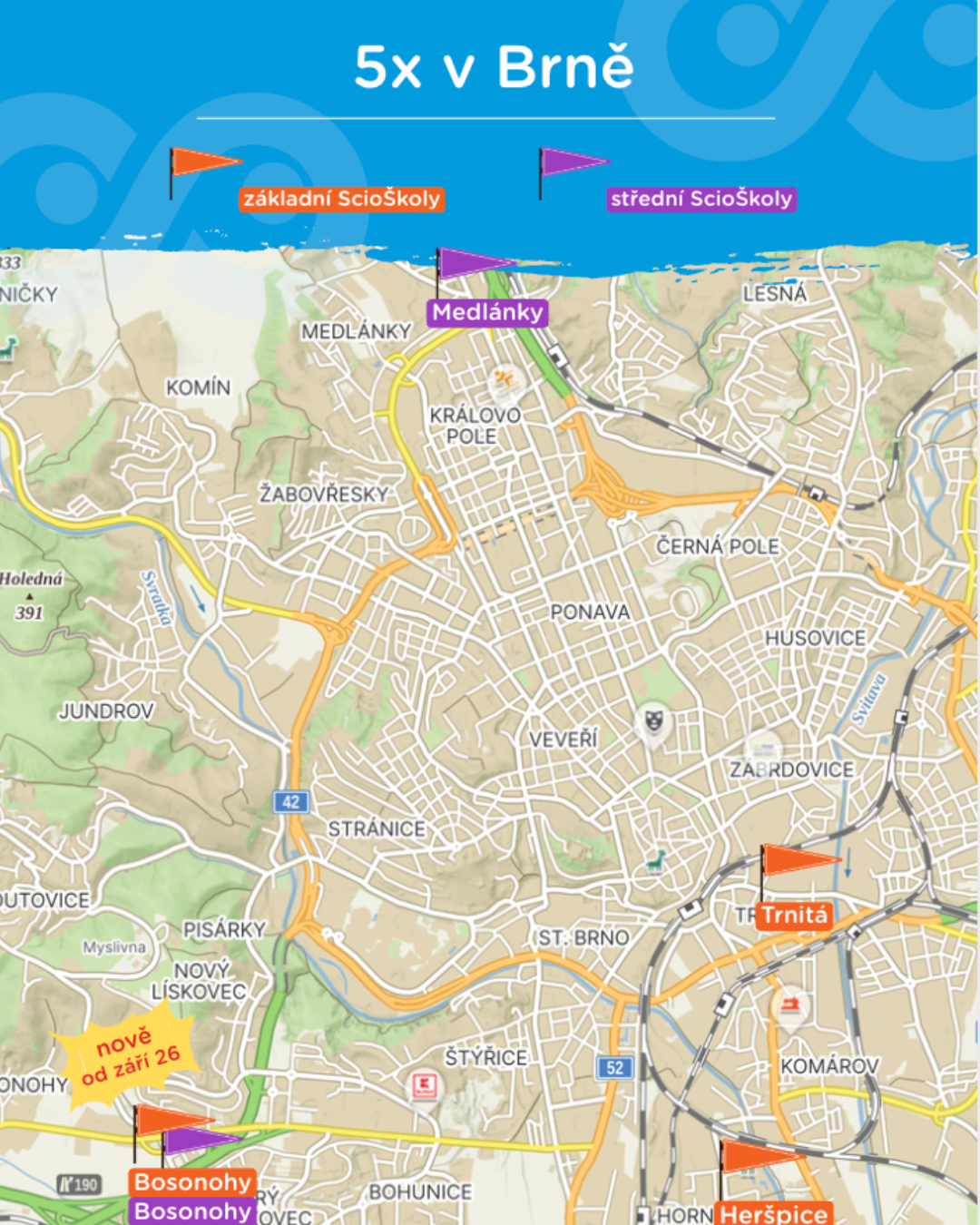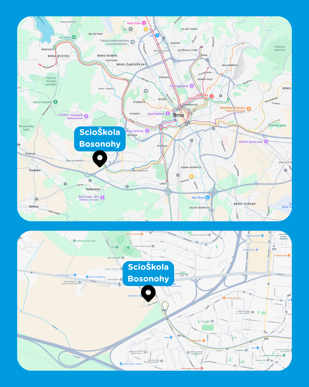 Možná vás při pohledu na název „Střední ScioŠkola Bosonohy“ napadlo, že to bude z centra Brna poměrně z ruky. Nenechte se ale zmást! Název jsme zvolili proto, že budova oficiálně leží na katastrálním území Bosonoh. Reálně se ale nacházíme na samém okraji, přímo na hranici se Starým a Novým Lískovcem.